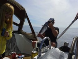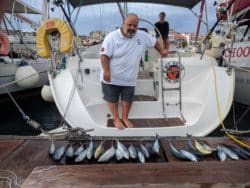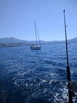 For per-person, you can join one of the regular trips, and while the boat goes from one beach to the next, you do troll fishing with our rods and fake plastic lures. That’s the only kind of fishing we do. It costs an extra 10€ per fisherman, payable in cash onboard, only upon successful fishing.
