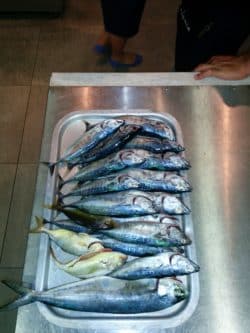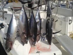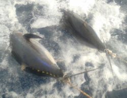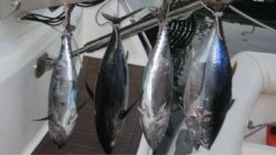 Onboard we have equipment for pretty big fish. We use fake plastic lures while searching for the feeding schools and fresh bait on social troll gear near the feeding frenzy area, with the largest equipment. Our crew is very knowledgeable about these kinds of fishing and usually, can find and catch the fish.