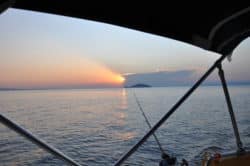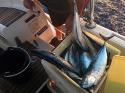 However, we do troll fishing which gives us the opportunity to catch mature palamida 1-4kg (Atlantic bonito) or karvouni  1-10kg (Little Tunny) using this method all day. Sometimes we can also catch a bigger 6-20Kg Albacore Tuna and the best times to catch them are around midday and at sunset. Time of the day that is easier to sail in your holidays.