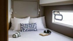 The 2023-built 5-cabin catamaran Bali 4.2 – is now berthed in Athens Riviera marina It has a saloon with two additional beds and one single cabin, four double rooms, and space for up to 11 passengers. The cost includes blankets and pillows. The Catamaran has 5 restrooms with showers. Classic mainsail, solar panels, bimini, and exterior GPS plotter are all included in the boat’s equipment. Additionally, it has a flybridge, an audio system, air conditioning, and heating. There is a freezer, coffee maker, oven, cooker and sink in the fully furnished galley.